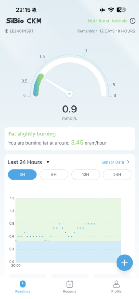 Por último, una foto de mi monitor continuo de cuerpos cetónicos SiBio CKM que ilustra a la perfección el punto que quiero transmitir. Si os fijáis estoy en 0.9 mmol/L, lo cual es un estado de cetosis considerable, y la app me dice traduciendo: ‘Quemando ligeramente grasa: Estás quemando grasa al ritmo de aproximadamente 3.45 gramos cada hora’.