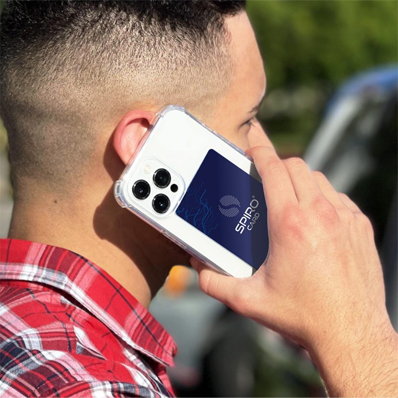 La SPIRO® CARD está diseñado para ser utilizado permanentemente en la funda del teléfono. La idea es que SPIRO® CARD está siempre en contacto con el dispositivo electrónico. Esto garantiza un filtrado constante de toda la contaminación electromagnética que pueda generar el aparato. Mucha gente lleva la tarjeta en una especie de tarjetero imantado que se sitúa en la parte trasera del teléfono móvil y es una manera correcta de utilizarlo. Carlos y Ricardo tienen iPhone sin funda (apple care recomendado si se usa sin funda) y el tarjetero imantado con una SPIRO® CARD fijado en la parte trasera.